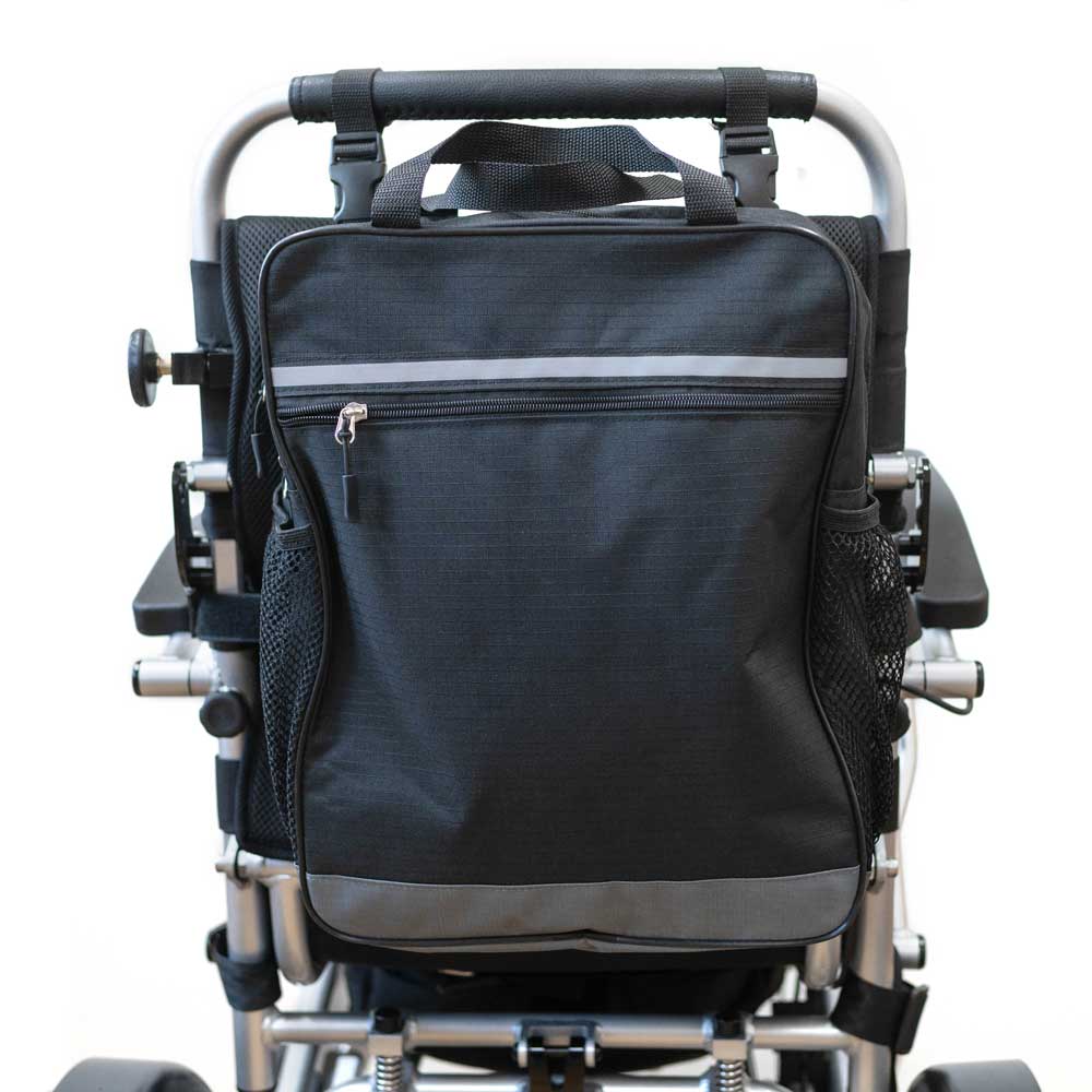 Vyzkoušejte dokonalou kombinaci prostornosti a odolnosti s naší taškou na opěradlo, která je navržena tak, aby dokonale pasovala ke všem modelům Eloflex. Tato všestranná taška se upevňuje pomocí popruhů kolem opěradla elektrického vozíku a poté se snadno sundává nebo nasazuje zpět pomocí rychloupínacích přezek a popruhů VELCRO®. Kromě velké hlavní přihrádky má taška prostornou přední kapsu a praktické boční kapsy ze síťoviny, které nabízejí spoustu možností pro uložení vašich věcí. Vak na opěradlo je vybaven reflexní páskou pro zvýšení bezpečnosti. Vejde se do 16 litrů a je 39 cm vysoká, 37 cm široká a 12 cm hluboká.