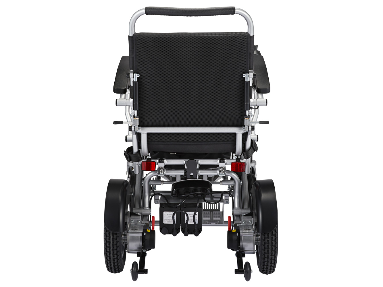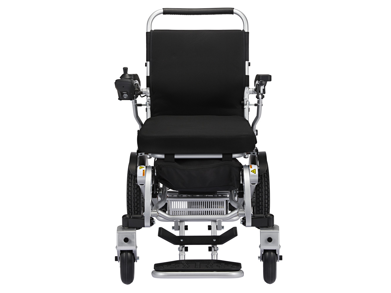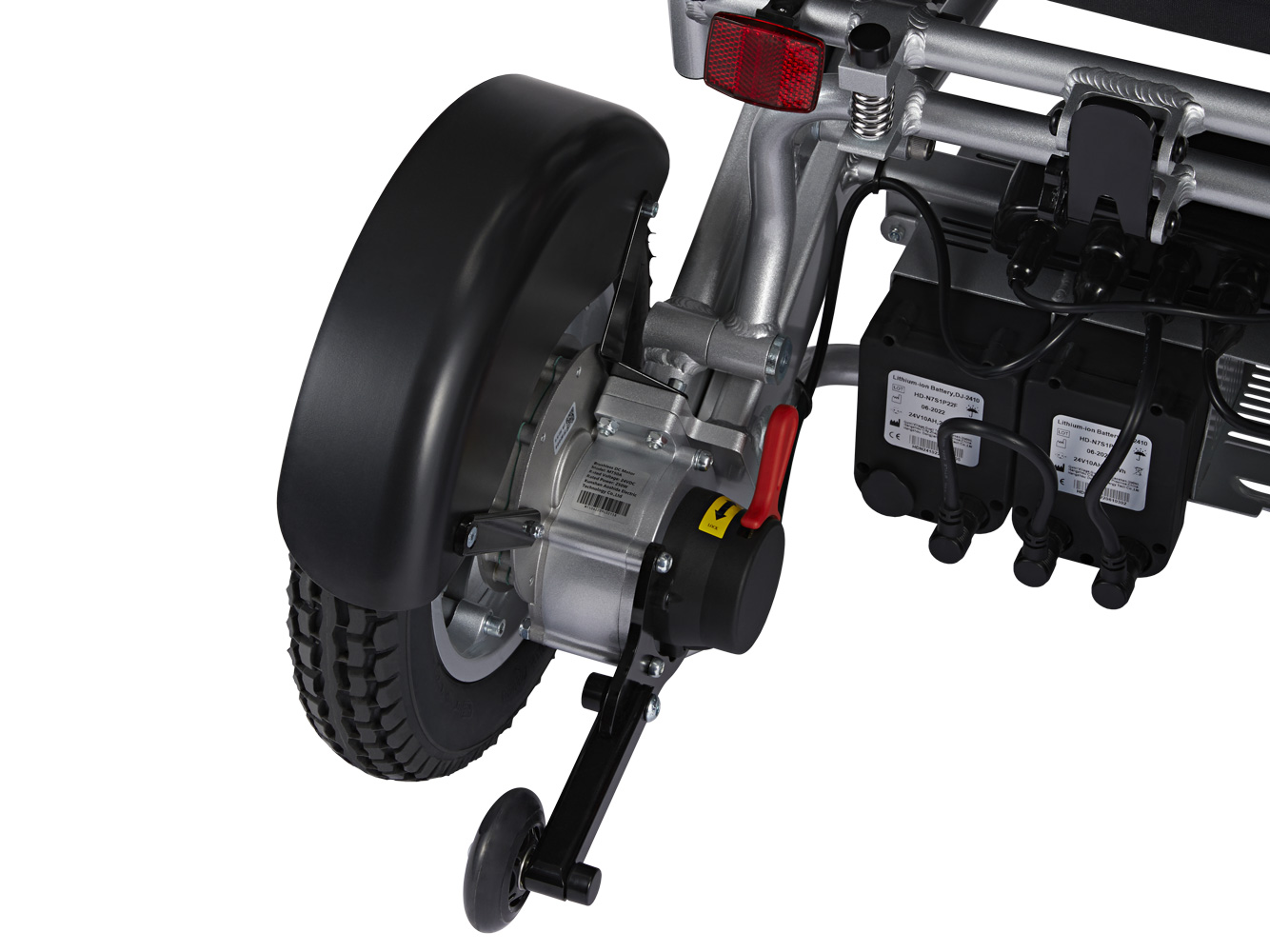 Důkladná pozornost byla věnována ergonomii a použitelnosti. Chytrý držák joysticku se dá sklopit, čímž krásně zajedete k okraji stolu, a opěrka nohou se při sezení nebo stání úhledně schová. Velká vzduchem plněná zadní kola a odpružené tlumení přední nápravy zajišťují dobré tlumení nárazů i na nerovném povrchu.