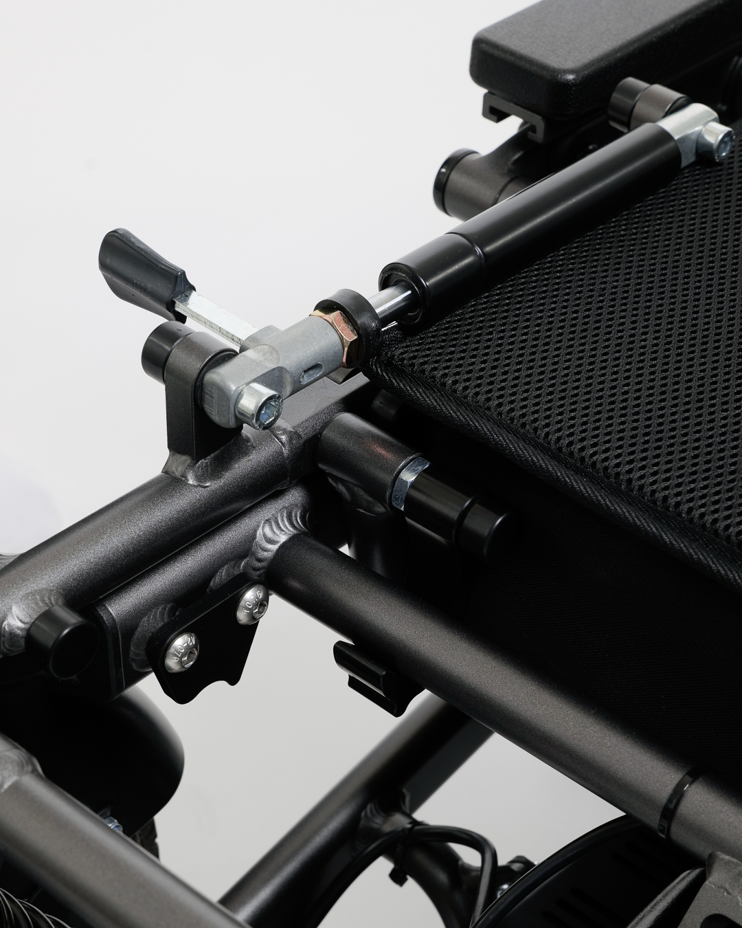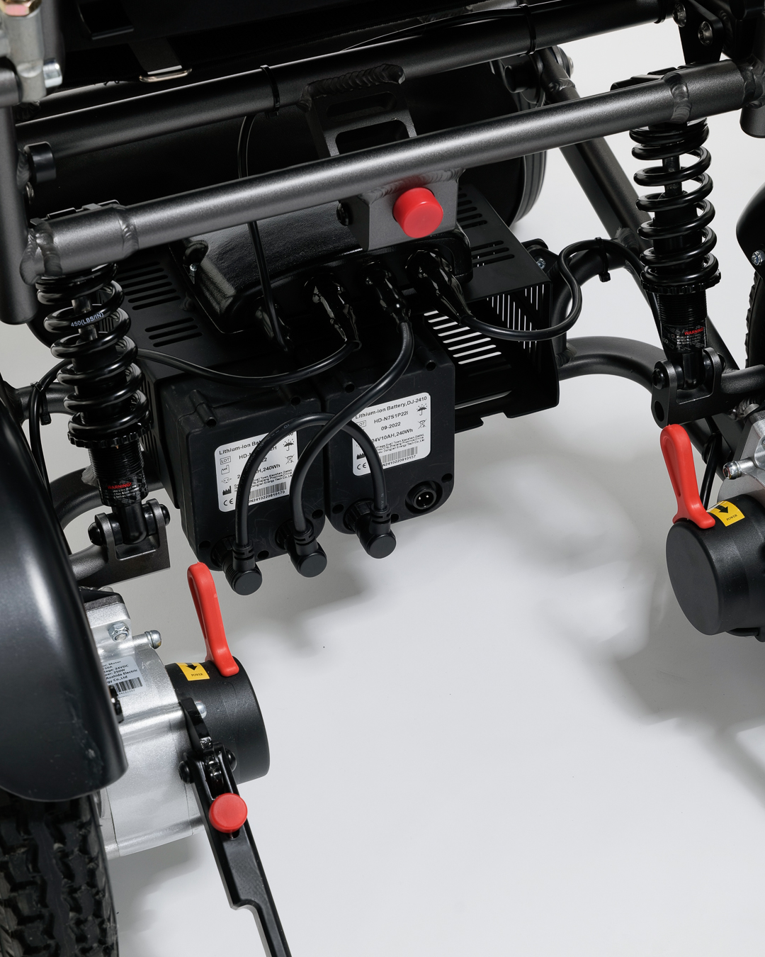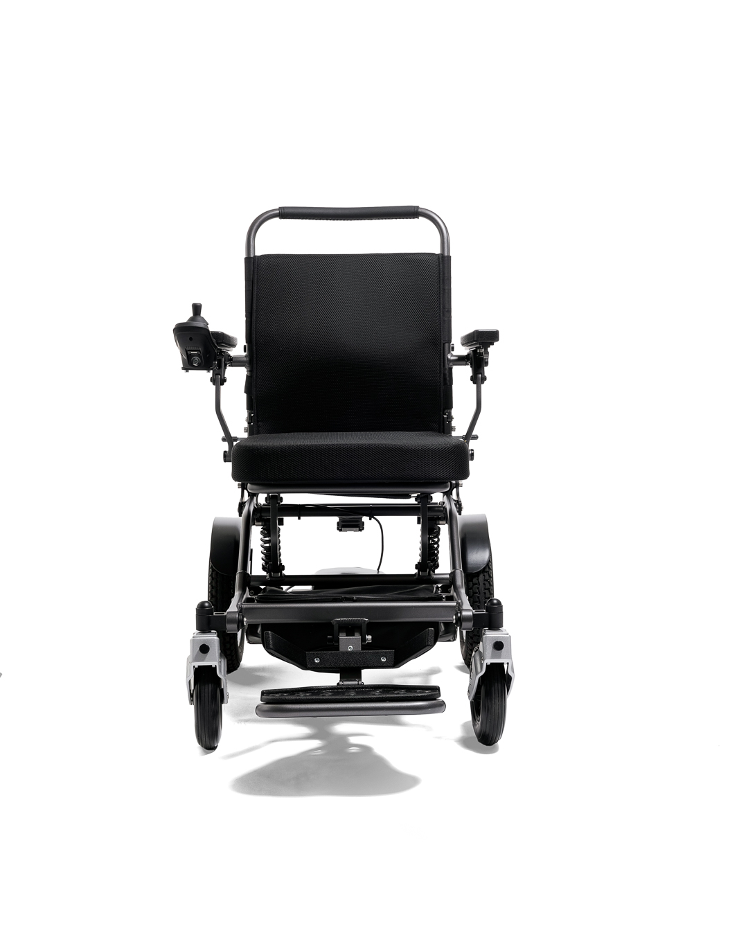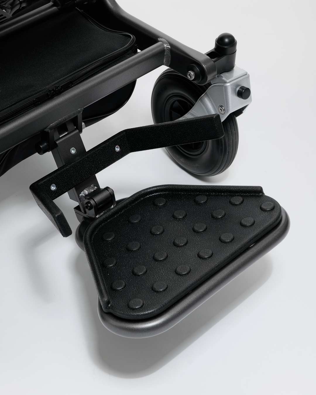 Nastavitelné područky a opěrky nohou umožňují přizpůsobené uchycení a dále zvyšují zaměření na komfort. Tento model je vybaven třemi sloty na baterie, což umožňuje prodloužené používání pro delší cesty. Když je složený, praktický bezpečnostní zámek udržuje invalidní vozík uzamčený ve složené poloze pro snadnou přepravu a uskladnění.