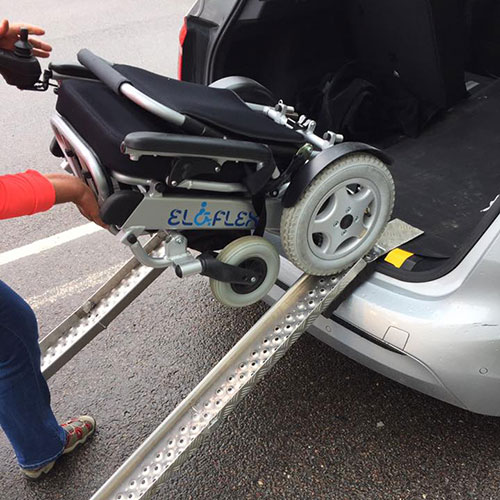 Nakládací rampa slouží jako cenný nástroj pro bezpečné naložení vozíku Eloflex do vozidla, zejména pokud je pro vás zvedání těžkých předmětů náročné. Umožňuje vyjet s vozíkem Eloflex na rampu ve složené poloze pomocí motorů vozíku. Existuje mnoho různých typů ramp: dlouhé, krátké, široké a úzké... Společnost Eloflex nabízí dva různé modely, které najdete v naší sekci příslušenství. Na obrázku níže uvádíme řešení, které nám poslal jeden z našich uživatelů a které se docela osvědčilo.