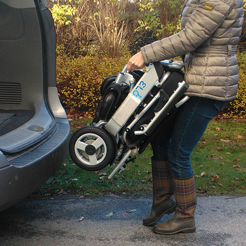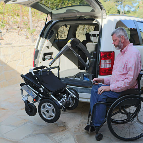 Metoda s nižším úchopem pro nižší postavy. Použijte kolečka, abyste vozík přetočili do kufru vozidla, a před zvednutím se ujistěte, že jste vypnuli motory.